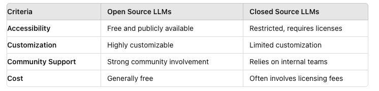 Accessibility: Open source LLMs are freely available for anyone to use. Whether you’re a startup or a large enterprise, you can access these models without the need for expensive licenses, making them an attractive option for businesses looking to experiment with AI.